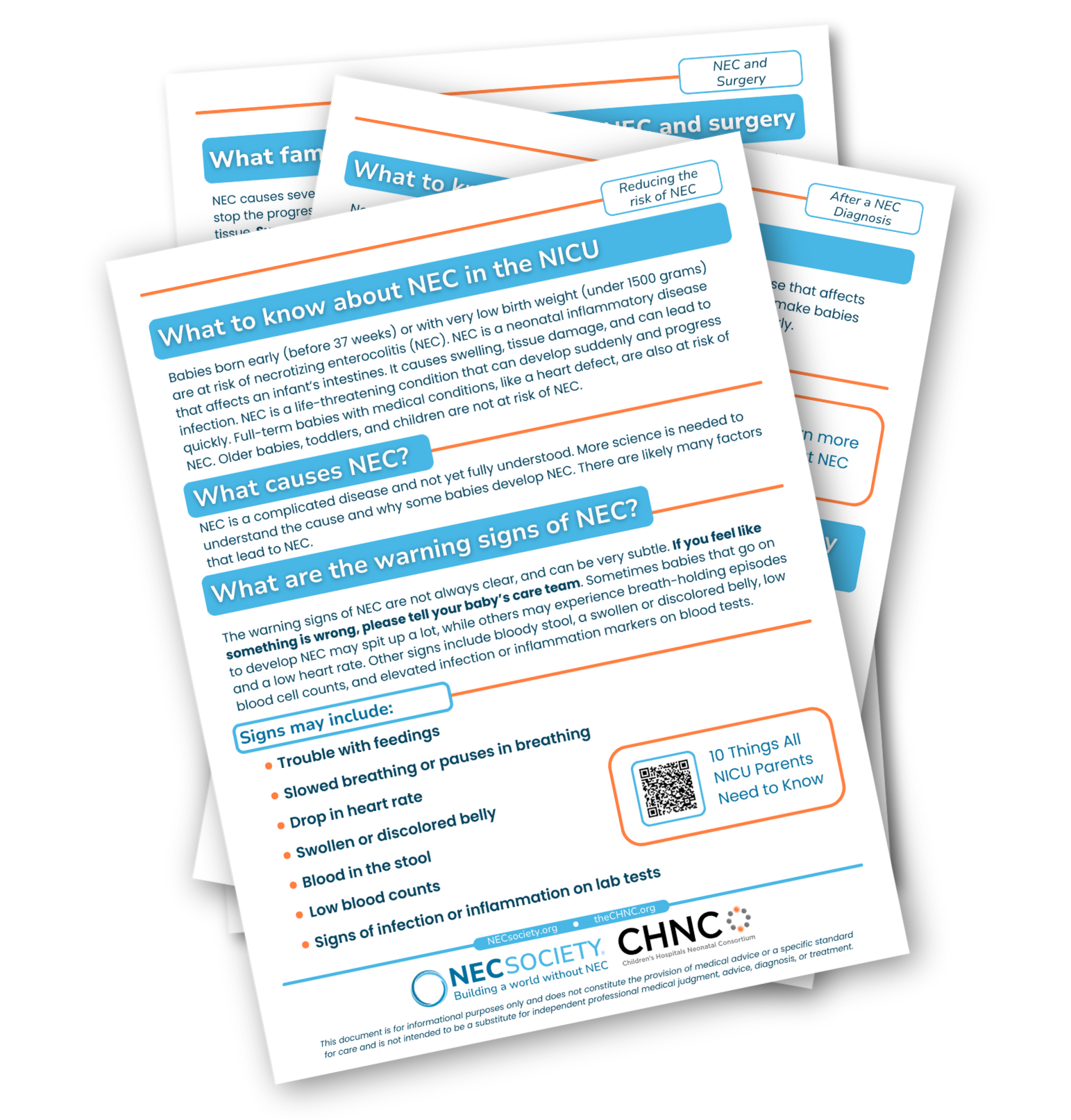 In partnership with the Children’s Hospitals Neonatal Consortium NEC Focus Group, we developed new resources to guide families at risk of or affected by NEC. These are the first resources designed to reach families before diagnosis, sharing essential information about risk factors and potential early warning signs to help build a world without NEC.